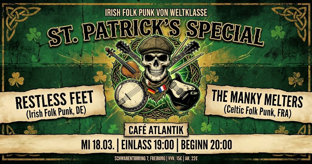Wenn der St. Patrick’s Day vorbei ist, fängt im Café Atlantik die Party erst richtig an. Wir verlängern den Feiertag und holen am Mittwoch, den 18.03., zwei absolute Schwergewichte des Celtic Folk Punk auf die Bühne.