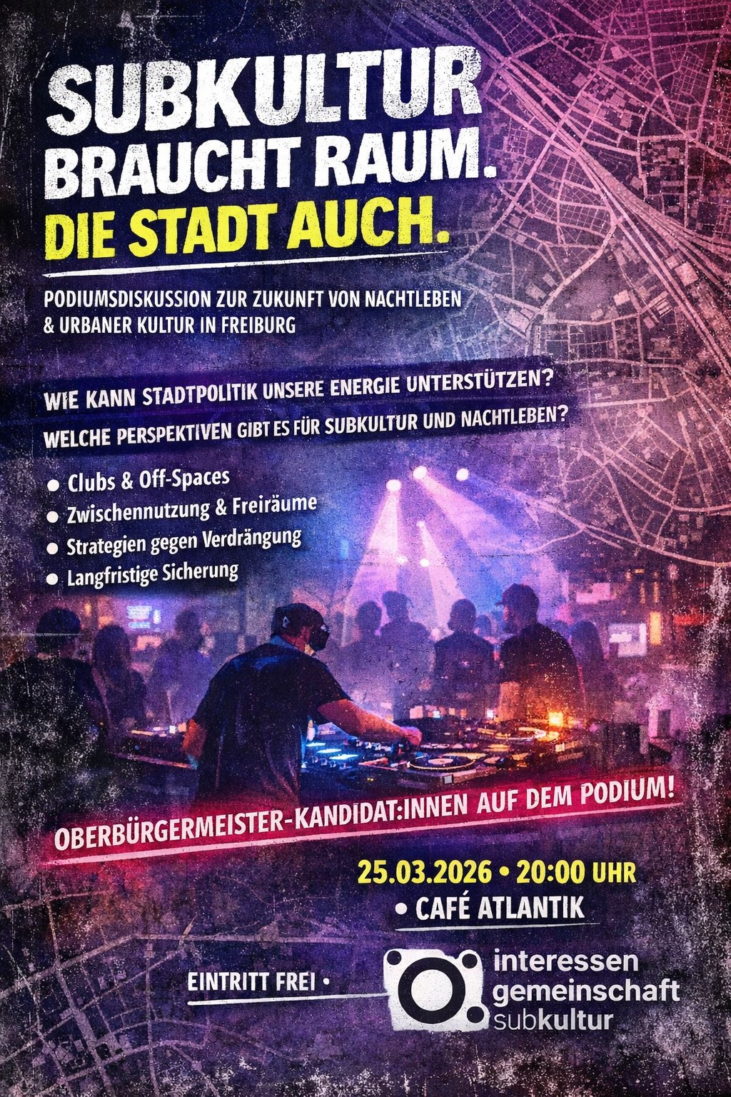 IG Subkultur lädt ein zu einer Podiumsdiskussion über Räume, Freiräume und die Zukunft urbaner Kultur in Freiburg.